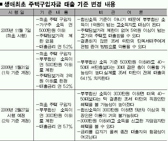 또한 전문가들은 27일부터 부부합산 소득을 3000만원 이하로 할 경우 생애최초 자금 대출 상품은 사실상 35세 이하나 자영업자들의 전유물로 전락할 가능성이 높다고 우려한다.40∼50대 직장인의 부부합산 소득이 3000만원 이하인 경우는 극히 드물기 때문이다. 합산 소득을 5000만원 이하로 제한했을 때도 생애최초 자금 대출자의 64.1%가 35세 미만이었다. 즉 결혼한 지 얼마 되지 않은 직장 5년차 미만의 젊은층이 대출자금의 64%를 재테크 차원에서 빌려 썼다고 봐도 무리가 아닌 것이다.