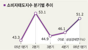 삼성경제연구소가 최근 전국 1000가구를 대상으로 소비자태도지수를 조사한 결과,1·4분기 소비자태도지수(51.2)는 지난해 4·4분기(46.1)보다 5.1포인트 상승했다. 소비자태도지수는 현재·미래의 생활형편과 경기, 내구재 구입 등에 대한 소비자들의 판단을 수치화한 것으로 기준치 50을 넘으면 긍정적 견해가 더 많다는 뜻이다. 특히 그동안 얼어붙었던 중·저소득층의 소비 심리도 서서히 풀리는 것으로 나타났다. 소득계층별 지수를 보면 ▲연소득 1000만원 미만이 48.1(작년 4·4분기 43.1) ▲1000만∼2000만원 미만 49.1(43.6) ▲2000만∼3000만원 미만 50.9(45.5) ▲3000만∼5000만원 미만 52.9(48.0) ▲5000만원 이상이 53.7(49.7)로 2000만원 이상 소득계층의 지수가 모두 기준치를 넘어섰다.