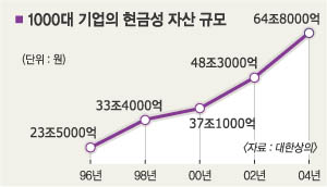 반면 기업들의 행보는 달랐다. 국내 1000대 기업의 현금성 자산 보유액이 크게 늘고 있어, 이를 투자로 연결시켜야 한다는 지적이 적지 않다. 상의가 이날 발표한 ‘국내 주요기업의 현금성 자산 변화추이와 시사점’ 보고서에 따르면 대기업의 현금성 자산은 96년 15조원에서 2004년엔 49조 4000억원으로 229% 증가했다. 중견·중소기업은 8조 5000억원에서 15조 3000억원으로 80% 많아졌다.