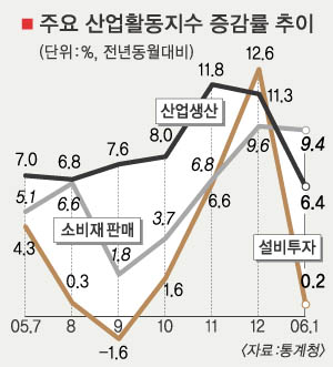 통계청이 28일 발표한 ‘2006년 1월 산업활동동향’에 따르면 지난달 산업생산지수는 전년 동월 대비 6.4%에 그쳐 전달 11.3%에 비해 증가폭이 절반으로 줄어들었다. 설비투자도 전년 동월 대비 0.2% 증가하는 데 그쳐 전월 증가율 12.6%에 비해 증가폭이 크게 둔화됐다.