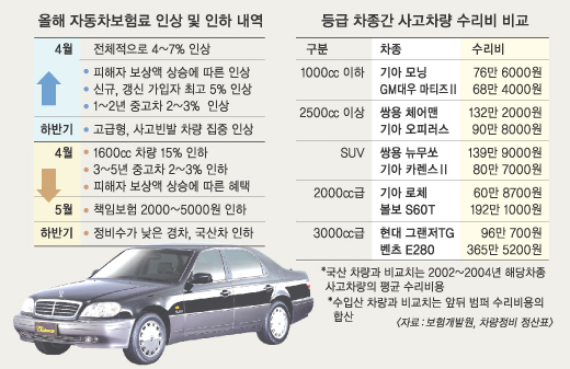 금융감독원과 보험업계는 차종별 보험료 차등화 제도를 연내 도입하는 방안을 추진중이다. 보험료가 다시 오르내리는 등 들썩일 것으로 보인다. 사고차량 정비수가는 차종에 따라 수십만원에서 수백만원까지 차이가 나지만 배기량이 똑같다는 이유로 동일한 보험료를 무는 불합리한 점을 개선하기 위해 차종별로 보험료를 달리 매기도록 한 것이다.