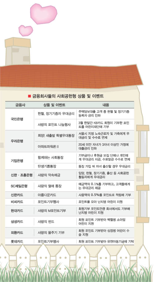 기업에 사회공헌 활동은 이제 선택이 아닌 필수가 됐다. 그동안 공공성은 무시한 채 돈장사에만 치중한다는 비판을 받아온 금융기관들도 재빠르게 사회공헌·공익형 상품을 내놓고 있다. 회사의 이미지를 제고시키고, 고객도 잡겠다는 이중포석인 셈이다.