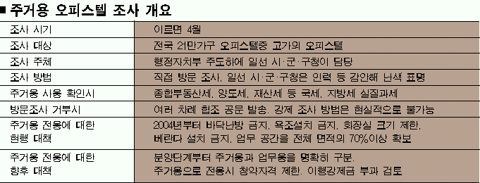 현장조사는 일선 시·군·구청이 맡을 예정이다. 현장조사를 통해 불법 전용 사례에 대한 정확한 조사가 이뤄지면 정부는 관련 부처간 태스크포스를 구성, 오피스텔의 주거용 전환을 차단할 수 있는 다양한 장치들을 늦어도 연말까지 마련할 방침이다.