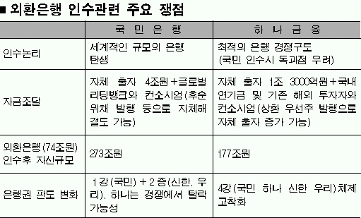 외환은행 인수에 필요한 자금은 대략 6조원으로 추산된다. 국민은행은 자체 출자가 가능한 돈이 4조원, 하나금융은 1조 3000억원 정도로 알려졌다. 자체 조달에서는 국민이 유리하지만 부족액에 대한 외부자금 조달은 하나가 한 발 앞섰다는 평가다.
