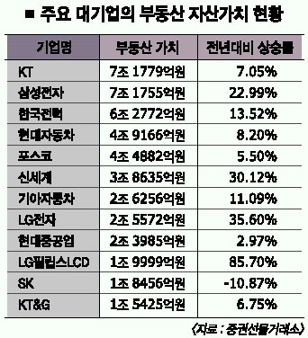 특히 신세계는 이마트 등 신규 점포에 대한 투자가 늘어 부동산 가치가 3조 8635억원으로 30.12% 증가했다.LG필립스LCD도 경기도 파주 LCD 단지에 대한 대규모 투자로 부동산(1조 9999억원)이 85.70%나 늘었다. 외국인 주주 칼 아이칸으로부터 부동산 자산의 매각을 요구받고 있는 KT&G도 전년보다 6.75%이 늘어난 1조 5425억원어치의 부동산을 보유하고 있다.