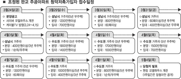 청약저축 가입자의 접수 일정은 5년 무주택 성남시 거주자의 경우 첫날인 29일 가입액은 1200만원 이상(분양),700만원 이상(임대)으로 당초와 같지만,30일은 800만원 이상(분양), 납입횟수 60회 이상으로 종전의 900만원 이상(분양),500만원 이상·납입횟수 60회 이상(임대)에서 변경됐다.31일 청약자는 성남시 거주자로 60회 이상 5년 무주택,400만원 이상 3년 무주택으로 바뀌었다.