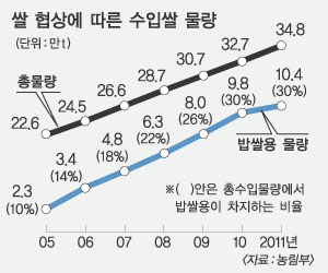 하반기에는 올해 수입물량 3만 4459t이 들어온다. 지난해 물량까지 합치면 올해 수입쌀은 국내 소비량의 1.4%에 이른다. 수입쌀 가운데 밥쌀용 비중은 현재 10%에서 2010년부터는 30%로 늘어나고 수입쌀은 국내 소비량의 2.7%까지 높아진다.
