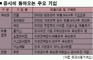 이들 기업들은 상장 폐지후 기업 인수합병(M&A)과 구조조정을 통해 체질을 강화한 뒤 상장 기업에 재도전하고 있다.