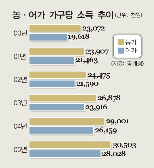 통계청이 28일 발표한 ‘2005년 농가 및 어가 경제 조사결과’에 따르면 지난해 농가의 가구당 전체 소득은 3050만 3000원으로 전년보다 5.2%, 어가는 2802만 8000원으로 7.1% 각각 늘었다. 그러나 본업인 농업소득은 1.9%, 어업소득은 0.1% 줄어들었다. 대신 이전소득은 농가 35.7%, 어가 52.0% 각각 급증했다. 겸업소득, 임대료 등 농·어업외 소득과 비경상소득도 소폭 늘어났다.
