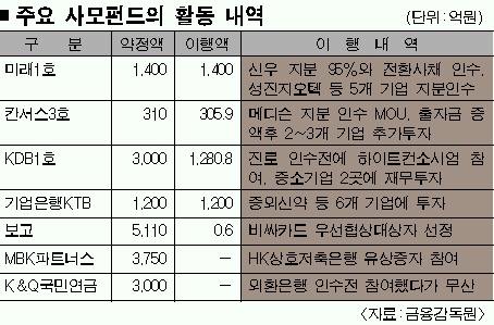 토종 사모펀드는 출범한 지 1년 정도 지났지만 기대만큼 제 구실을 못해 ‘개점휴업’이라는 비아냥을 들어야 했다. 국내 1호 ‘칸서스1호’(지난해 3월29일 등록)는 3900억원을 모으고도 적당한 매물을 찾지 못하다 진로 인수전에서 실패한 뒤 투자신뢰를 잃고 곧 해산될 운명에 놓였다.