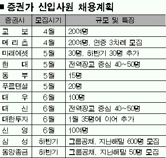교보증권은 지난해 하반기에 25명의 신입사원을 선발한 데 이어 이달에도 20여명을 뽑는다. 지난 1월에 20명을 이미 채용한 메리츠증권은 이달에 추가로 20여명을 뽑기로 했다. 미래에셋증권은 5월 중에 30명을 선발하고 하반기에 30명을 더 모집할 예정이다. 현대증권은 같은 달 전역 장교 예정자를 대상으로 40∼50명을 채용한다. 현대증권의 상반기 공채는 2002년 이후 처음이다. 대신증권도 전역 장교 위주로 40∼50명을 뽑는다. 대우증권은 6월에 100명 이상의 신입 사원을 모집할 예정이다. 대한투자증권은 지난 1월 35명에 이어 6월에도 추가모집을 검토하고 있다.
