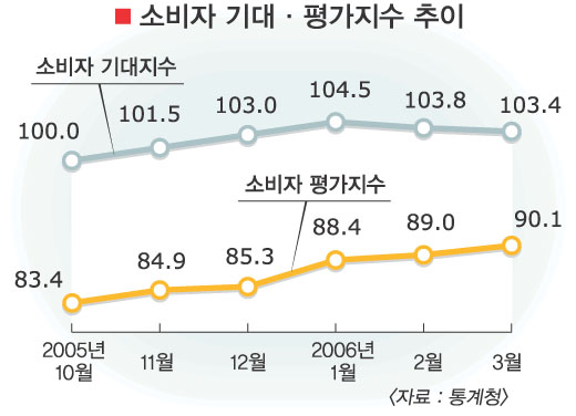 통계청이 6일 발표한 3월 소비자전망조사에 따르면 현재와 비교해 6개월 뒤의 경기·생활형편·소비지출에 대한 소비자들의 심리를 보여주는 소비자기대지수는 지난달 103.4로 전월보다 0.4포인트 떨어졌다.