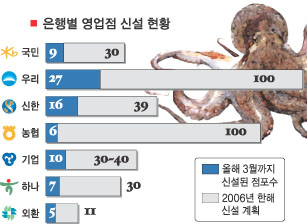 은행들의 점포 확장 기세가 무섭다. 서울신문이 10일 국민, 우리, 신한, 하나, 기업, 농협, 외환 등 7개 주요 은행의 올해 1∼3월의 신설 점포수를 확인한 결과 80개에 이르렀다. 이 은행들은 연말까지 270개의 점포를 더 낼 계획이다. 은행들은 “치밀한 시장조사를 통해 신설 계획을 세운 만큼 아무런 문제가 없다.”고 주장한다. 그러나 일부 전문가들은 “최근의 점포 확장이 ‘친구따라 강남가기식’으로 진행되고 있다.”면서 “무분별하게 점포수를 늘리고, 무리하게 대출을 추진하다 보면 은행권 전체가 부실해질 우려가 있다.”고 충고하고 있다.