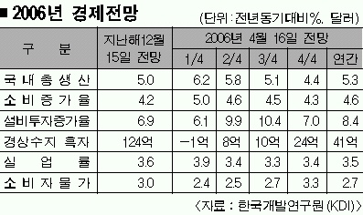 KDI는 이날 발표한 ‘2006년 경제전망’에서 1·4분기 중 국내총생산(GDP) 성장률 6.2%에 힘입어 올해 연간 성장률은 당초 전망치 5%보다 높은 5.3%에 이를 것으로 예상했다. 지금까지 수출 증가세가 유지되고 있으며 소비 회복세도 계속돼 경기상승이 지속되고 있다고 설명했다.