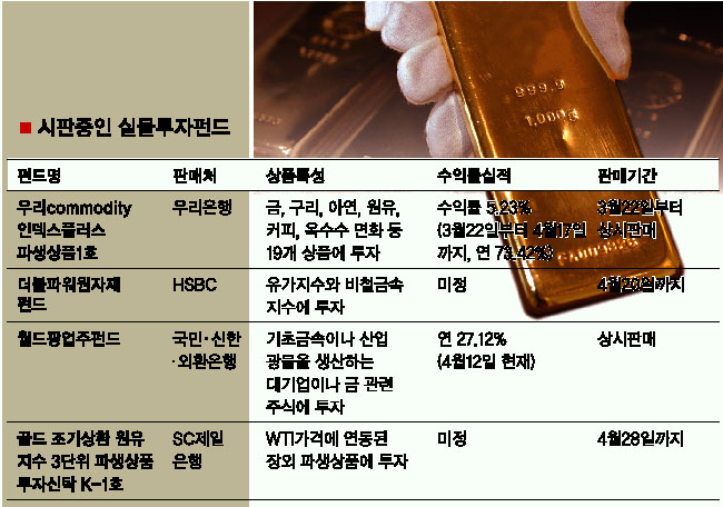 국제유가와 구리값 사상 최고, 금과 은값은 각각 25년과 22년만의 최고치…. 요즘 외신들에 자주 등장하는 원자재값 폭등 소식이다. 기업들 자신과 기업의 수익이 반영되는 주식·채권시장에는 안 좋은 소식이지만, 원자재에 투자하는 펀드의 수익률은 되레 높아질 수 있다. 최근에는 개인투자가들도 실물(원자재·commodity)에 투자할 수 있는 펀드가 나오고 있어 관심을 가져볼 만하다.