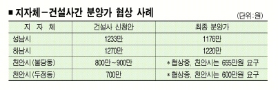 천안시는 또 A건설이 두정동에 지으려는 아파트 평당 분양가는 600만원이 적정하다고 판단하고 있다.A건설이 책정한 평당 700만원선과는 무려 100만원 차이가 난다. 앞서 하남시는 풍산지구 아파트 평당 분양가를 50만원 낮춘 1220만원에 승인했다.6개월여 협상 끝에 건설사들이 결국 분양가를 내린 것이다.