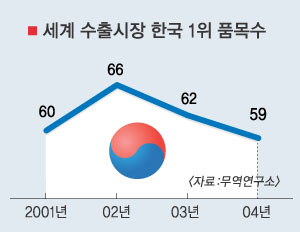 한국무역협회 무역연구소는 유엔 무역통계를 분석한 결과,2004년 현재 한국의 세계 수출시장 점유율 1위 품목(HS 6단위 기준)은 59개로 2003년보다 3개 감소했다고 7일 밝혔다. 세계 1위 한국제품은 2001년 60개에서 2002년 66개로 늘었지만 이후 내리막길을 걷고 있다. 세계 수출시장 1위 품목은 섬유 및 의류 20개, 철강 9개, 선박 4개, 가전(냉장냉동고) 1개, 무선통신기기 1개 등이었다. 굴, 인삼도 1위를 달렸다.2003년까지 1위였던 메모리반도체와 중형자동차는 해외 현지생산이 늘면서 1위자리를 내놓았다.
