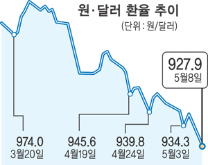 8일 서울 외환시장에서 원·달러 환율은 전장(4일)보다 무려 11.70원 떨어진 927.90원에 장을 끝냈다. 종가는 1997년 10월23일 921.00원 이후 최저 수준이며, 이날 낙폭은 6개월 만에 가장 컸다. 이에 따라 올들어 원화가치는 지난해 말 대비 9.02%나 뛰었다.