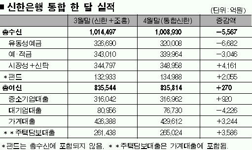 8일 신한은행에 따르면 통합 직전인 지난 3월말 현재 신한은행과 조흥은행의 총수신 합계는 101조 4497억원이었다. 그러나 신한과 조흥이 한 몸이 돼 1개월이 지난 4월말 현재 잔액은 100조 8930억원으로 5567억원이 줄었다. 총여신은 83조 5544억원에서 83조 5814억원으로 270억원 증가했다.