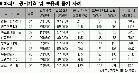 강남 지역 이외에 양천(매매가 상승률 18.17%)·영등포(16.32%)·용산(13.38%)·성동(11.39%) 등 지역내에서도 보유세가 오른 곳이 많다. 이들 지역은 재건축 규제에 따른 ‘풍선효과’로 올해초 기준 아파트값 상승률이 전년보다 10% 이상 올랐다.