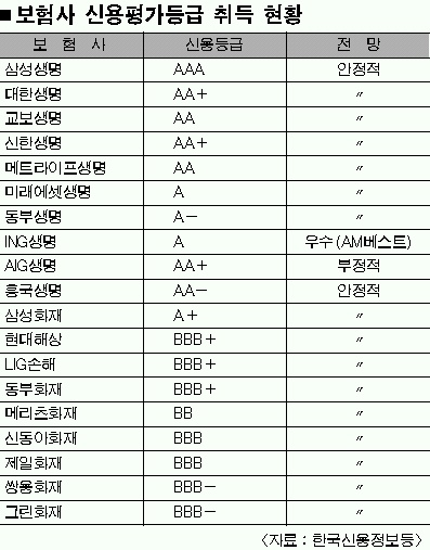 삼성생명은 이미 지난해 12월 국내 보험사로선 최고인 ‘AAA’를 받아 ▲수익성 ▲재무건전성 ▲상품개발능력 ▲영업력 ▲브랜드가치 등 전 부문에서 최선두임을 과시했다. 대한생명과 생보업계 2위를 다투는 교보생명은 대생이 한 단계 높은 등급을 받는 바람에 자존심을 구긴 셈이다. 국제 재보험거래 때문에 S&P 등 외국 신용평가사로부터 일찌감치 평가를 받아둔 손보사들은 자동차보험의 불안정성이 감안된 탓인지 B계열 신용등급이 많았다.