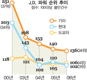 2000년 조사에서 최하위(37위)였던 기아차는 지난해(30위)보다 6단계 상승했지만 24위에 머물렀다.