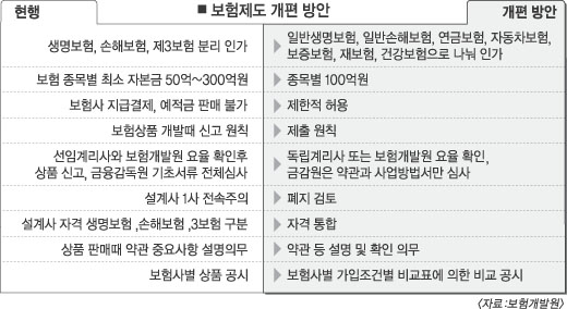 개편안에 따르면 보험사의 업무영역은 3년간의 유예기간을 거쳐 일반생명보험(사망담보보험), 연금보험(퇴직연금포함), 일반손해보험, 자동차보험, 보증보험, 재보험, 건강보험 등 7개로 나눠진다. 이중 리스크(위험)가 큰 일반생명보험과 일반손해보험은 함께 할 수 없지만 나머지는 추가로 늘릴 수 있다. 즉 생명보험사에서 자동차보험을 팔고 손해보험사에서 연금보험을 팔 수 있게 된다. 진입규제 완화차원에서 종목별 최소 자본금 기준도 현행 50억∼300억원에서 100억원으로 똑같이 적용된다.