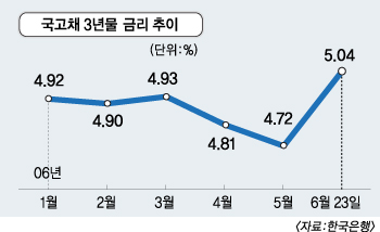 금리한국은행이 6월 콜금리를 인상하면서 사실상 저금리 시대는 끝났다는 것이 일반적인 분석이다. 미국을 비롯,EU, 일본도 정책금리의 인상을 추진하는 데서 알 수 있듯 금리인상 기조는 세계적인 추세로 자리잡고 있다. 한은 이성태 총재도 취임 직후 물가에 대한 선제적인 대처를 강조했던 만큼 하반기에는 1∼2차례 콜금리 추가 인상이 예상된다. 하지만 금리가 오르면 빚을 내 집을 산 서민들은 이자 부담이 늘고 결국 이로 인해 소비가 위축되는 악순환이 예상된다. 경기 회복세에 찬물을 끼얹는 수준의 급격한 금리인상은 없을 것으로 전망된다. 이런 점에서 올 하반기 시장금리도 5%대에서 큰 변동없이 안정세를 보일 것으로 예상된다.