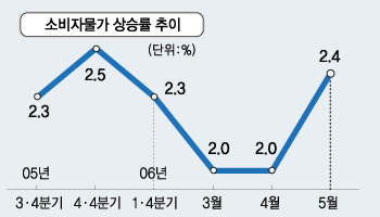 소비자물가는 올들어 1·4분기까지는 안정세를 유지했다. 국제 유가가 크게 올랐지만, 환율 하락(원화강세)이 이를 상쇄했다. 하지만 지난 5월에는 지난해 같은 달보다 2.4%,6월엔 2.6% 오르는 등 상승폭이 커지고 있다.