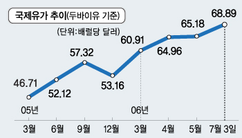 두바이유는 지난 3일 배럴당 68.89달러로 사상 최고치를 갈아치우는 등 높은 수준을 유지하고 있다. 전문가들은 두바이유 가격이 연평균 배럴당 70달러를 넘어서면 세계 경제에 직접적인 악영향을 미칠 것으로 보고 있다. 삼성경제연구소는 하반기에도 상승세는 이어져 국제 유가는 두바이유 기준으로 올해 연평균 배럴당 58∼68달러선을 기록할 것으로 전망하고 있다.