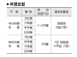 가족여행의 경우 가족형 상품을 고르면 자녀는 물론 만 70세 전후 부모님도 가입이 가능하다. 연령에 따라 보장내역이 조금씩 다르므로 내역을 확인해야 한다. 예컨대 가족형은 가입자 본인만 식중독 등 질병치료가 보상되는 경우가 있어 사전에 보장내역을 확인, 필요에 맞게 조정해 해둘 필요가 있다. 손해보험협회에 따르면 국내 여행보험은 보험료가 1인당 3일 기준으로 5000원 안팎, 해외 여행보험은 일주일 기준으로 1만 5000원 안팎이다.