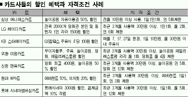 기업은행이 지난 3일부터 발급하는 ‘제로팡팡카드’도 ℓ당 130원을 깎아주지만 10,20,30일에만 제공한다.LG카드의 ‘위키카드’는 ℓ당 80원을 적립해 주지만 월 주유액이 40만원이 넘으면 적립이 안 된다. 대부분의 카드사가 제공하는 영화할인, 놀이공원할인 등도 횟수 제한이 있다.