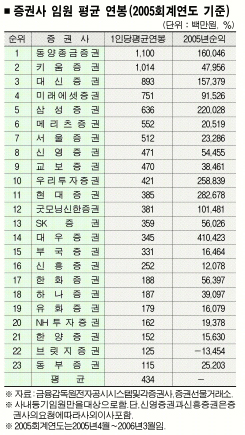동부증권은 2005회계연도에 순이익 252억원으로 전년 대비 945.77% 폭증하며 전 증권사를 통틀어 가장 높은 신장세를 보였지만 연봉은 제일 박했다.NH증권은 순이익 193억원으로 흑자전환해 양호한 실적을 거뒀지만 역시 임원들의 연봉에는 인색했다. 이에 비해 임원들의 연봉이 가장 많은 동양종금증권은 지난 회계연도 순이익이 1600억원으로 전년 동기 대비 49.25% 증가했지만, 순이익 규모는 전체 5위였고 순이익 증가율도 17위에 그쳤다.