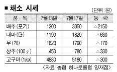 이준용 농협하나로클럽 바이어는 “주산지의 호우 피해가 큰 야채값이 급등했고, 상승세는 8월 초까지 이어질 것”이라면서 “비가 계속 오면 물량 확보가 어려워지는 데다 신선도도 떨어져 우량 상품 위주로 값이 뛸 수 있다.”고 설명했다.