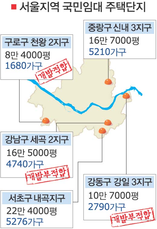 건설교통부는 31일 “서울 강남구 세곡 2지구와 강동구 강일 3지구, 구로구 천왕 2지구 등 그린벨트 3곳에 국민임대 주택단지를 짓기 위해 중도위에 그린벨트 해제를 위한 국책사업 지정을 신청했으나 세곡 2지구와 강일 3지구 등 2곳은 개발 부적합 판정을 받았다.”고 밝혔다. 부적합 판정을 받은 지역은 지금처럼 그린벨트로 보존된다. 이에 따라 연내 서울지역 그린벨트 조정가능지 5곳을 국민임대 주택단지지구로 지정하고 이곳에 1만 4000여가구를 지어 서민 주거안정을 꾀하려던 건교부와 서울시의 계획은 차질을 빚을 전망이다. 해당 지역 임대주택을 염두에 뒀던 서민들의 불만도 예상된다.