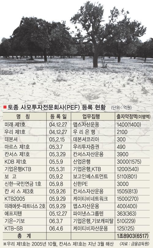 실제로 일부 금융기관들이 PEF의 설립을 포기하거나 펀드 규모를 줄였다. 국민은행은 2004년말 3000억원 규모의 PEF를 추진하다 중도에 포기했다. 하나은행도 지난해 12월까지 1000억원을 목표로 펀드 설립에 나섰지만 투자자 모집이 여의치 않아 해산했다.