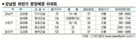 1일 스피드뱅크에 따르면 올해 하반기 서울 강남·서초·송파 등 강남 3구에 공급될 아파트는 5곳 499가구이다. 이중 일반분양으로 풀릴 물량은 364가구로 집계됐다. 지난해 같은 기간 강남 지역 일반분양 물량은 363가구, 올해 상반기에는 490가구였다. 중소형 통장 가입자들은 기회를 놓치지 않는 것이 낫다. 교육·교통 환경이 뛰어난 강남 요지에서 분양되는데다 중소형 통장은 청약제 개편으로 2008년부터 청약기회가 점차 줄어들기 때문이다.
