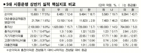 영업 경쟁을 주도했던 우리은행은 6월말 총자산이 162조원으로 지난해 말보다 무려 15.7%나 늘어났지만 전년 동기 대비 ROA는 0.06%포인트밖에 개선되지 않았고,ROE는 0.3%포인트 후퇴해 수익성 강화가 시급한 과제로 떠올랐다.