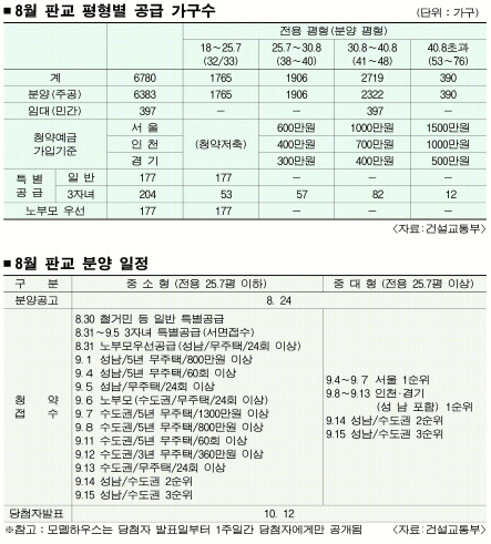 3일 건설교통부에 따르면 오는 30일부터 청약하는 판교 2차 분양에는 중소형(전용면적 25.7평 이하)아파트 1765가구와 청약예금 가입자가 청약할 수 있는 중대형(전용 25.7평 초과)4618가구, 민간임대 397가구가 나온다. 연립주택 공급 시기가 지연돼 당초 공급 물량에서 384가구 줄었다.