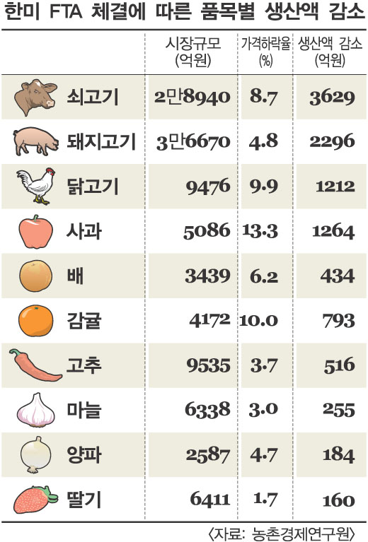 한·미 자유무역협정(FTA) 체결로 농산물 시장이 개방되면 축산과 낙농(우유) 분야에서만 5000억∼1조원의 피해가 발생하는 등 쌀을 제외한 전체 농산물의 생산 감소액이 1조 4500억∼2조 2500억원에 이를 것으로 분석됐다.