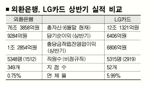‘사상 최대 실적 잔치의 그늘을 아시나요.’올 상반기 은행과 카드 업계의 ‘어닝 서프라이즈’를 주도한 곳은 외환은행과 LG카드다. 외환은행은 자산 규모가 훨씬 큰 우리은행이나 하나은행보다도 많은 9284억원의 순이익을 올렸다.LG카드는 6406억원의 순이익을 올려 6개 전업 카드사 총순이익의 60%를 차지했다.