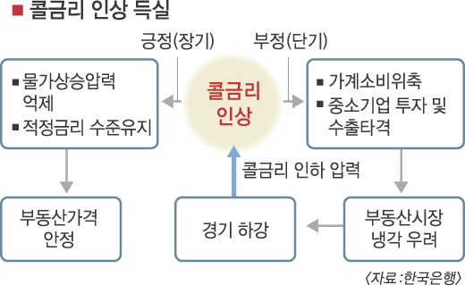 한국은행의 콜금리 인상은 우리 경제에 득(得)이 될까, 실(失)이 될까. 정부가 경기부양을 위해 적극적인 재정집행에 나서고 있는 점을 감안하면 콜금리 인상은 다분히 경기와 역행하고 있는 듯하다. 통상 경기가 좋지 않을 때는 금리를 내리는 게 일반적이다. 하지만 이번 콜금리 인상의 효과는 정부가 경제정책을 어떻게 끌고 가느냐에 따라 달라질 것으로 예상된다.