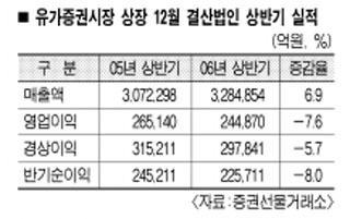 원화 강세, 원자재값 상승, 고유가 등 ‘3고(高)’로 상장사들의 영업이익이 크게 줄어들었다.17일 증권선물거래소와 한국상장사협의회가 12월 결산법인을 대상으로 집계한 ‘2006년 상반기 기업실적’에 따르면 548개 유가증권시장 상장사의 총매출액은 328조 4854억원으로 지난해 같은 기간보다 6.9% 늘었다. 그러나 영업이익은 24조 5870억원으로 7.6% 줄었다.
