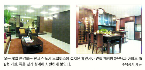 판교에는 주택공사가 직접 설계한 1950가구와 주공이 턴키 발주해 대형 건설사가 짓는 4433가구가 나온다. 박찬흥 주공 주택계획팀장은 “주공의 새 브랜드인 휴먼시아가 도입되는 첫 작품인 만큼 민간 건설사들이 짓는 아파트에 뒤지지 않게 평면·설계 수준을 높였다.”고 말했다. 최근 분당 오리역 인근에서 공개된 주공 모델하우스에는 주공이 공급하는 총 15개 평형(아파트 9개·연립주택 6개) 가운데 공급가구 수가 많은 32·38·45·61평형 아파트와 53·76평형 연립주택 등 모두 6개 평형의 견본 주택이 마련돼 있다.