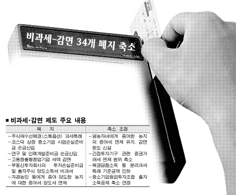 내년부터 국민과 기업에 세금을 깎아주거나 면제해 주는 226개 비과세ㆍ감면 제도 중 34개가 폐지 또는 축소된다. 올해로 일몰이 도래하는 55개 제도 가운데 27개와 일몰이 없는 7개 제도가 수술 대상이다.이에 따라 정부는 2010년쯤부터는 연간 2조원 안팎의 세수증대 효과를 거둘 수 있을 것으로 내다보고 있다.
