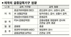 외국은 어떨까. 감독기관의 통합 여부와 달리 금융상품의 권유·판매행위는 영업행위로 규정, 금융상품 위주로 검사를 나간다. 자본시장통합법의 모델인 호주에서는 증권투자위원회(ASIC)가 영업 행위를 검사하고, 건전성 규제는 금융감독청(APRA)에서 각각 담당한다. 영국은 금융감독청(FSA)에서 건전성 감독과 영업행위 규제를 모두 맡지만 검사는 판매상품 위주로 이뤄진다. 일본의 금융청도 마찬가지다.