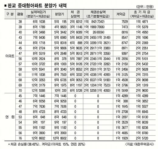 44평형 순수 분양가는 평균 5억 8318만원이다. 그러나 채권상한액(6억 888만원)을 써서 당첨됐을 경우 채권손실액이 무려 2억 3399만원이고, 이 중 계약 때 내야하는 채권초기분할 매입금은 1억 3621만원이다. 이에 따라 실제 분양가는 8억 1718만원이며, 계약할 때 2억 6369만원을 손에 쥐고 있어야 한다.56평형은 계약자금이 2억 5101만원이고,69평형은 3억 1319만원이다.