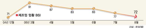 이는 2004년 12월의 71 이후 1년 8개월만에 가장 낮다. 제조업 업황 BSI는 올해 3월 91에서 4월 87,5월 83,6월 83,7월 77,8월 72 등으로 계속 떨어지고 있다. 업황 BSI가 100 미만이면 경기를 나쁘게 보는 기업이 좋게 보는 기업보다 더 많다는 뜻이다.