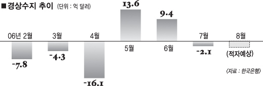 한은은 올해 경상수지가 균형 수준(제로)으로 떨어질 가능성이 크다고 진단했다. 한은은 지난해말 올해 경상수지 규모를 160억달러로 추정했다. 이후 지난 3월 100억달러,7월 40억달러로 각각 수정했다. 고유가에 따른 원유 수입액 급증, 그에 따른 상품수지 흑자 규모 축소, 여행서비스 수지 적자 확대 때문이라는 설명이다.
