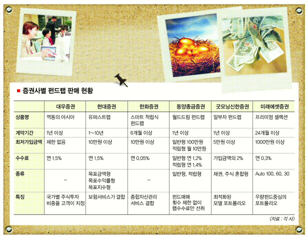 증권업계에 따르면 주요 7개 증권사의 랩어카운트 판매잔고가 총 5조원이 넘어섰다. 대우증권과 현대증권은 지난해말 대비 각각 5000억원,2000억원이 증가했다. 대우증권이 판매하고 있는 마스터랩 ‘역동의 아시아’는 올해 대우증권의 대표상품이다. 중국, 인도, 일본, 한국 등 각국의 주식형 펀드를 활용해 자유롭게 분산 투자할 수 있도록 설계됐다. 고객이 각 펀드의 투자비중을 직접 선택할 수 있고, 지역 투자비중뿐만 아니라 주식 투자비율도 조절할 수 있는 고객 맞춤형 상품이다. 가입 대상과 투자 금액의 제한이 없고, 가입 후 언제든지 편입 포트폴리오를 재조정할 수 있다. 해지수수료는 없다.